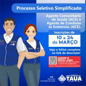 Você está em:Página Inicial»Notícias»PROCESSO SELETIVO SIMPLIFICADO PARA AGENTE COMUNITÁRIO DE SAÚDE (ACS) E AGENTE COMBATE ÀS ENDEMIAS (ACE) 2025»banner edital tauá